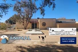 Animal Shelter building with dogs, trees, and clear sky in the background.