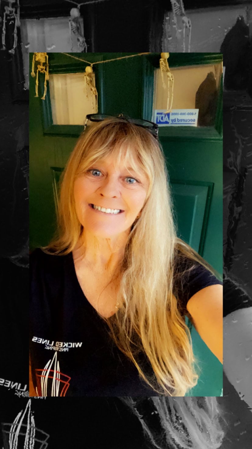 Smiling woman with blonde hair and sunglasses on her head in front of a green door with skeleton decorations.