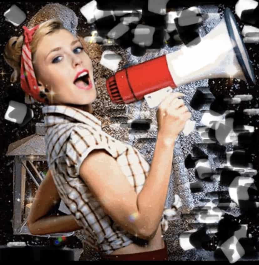 Megaphone, scattered pills and spilled powder on glitter background, woman in retro outfit and headscarf, emergency alert, chaotic scene, cracking effect, vintage vibe, crafting images, craftykates, creative design, playful composition.