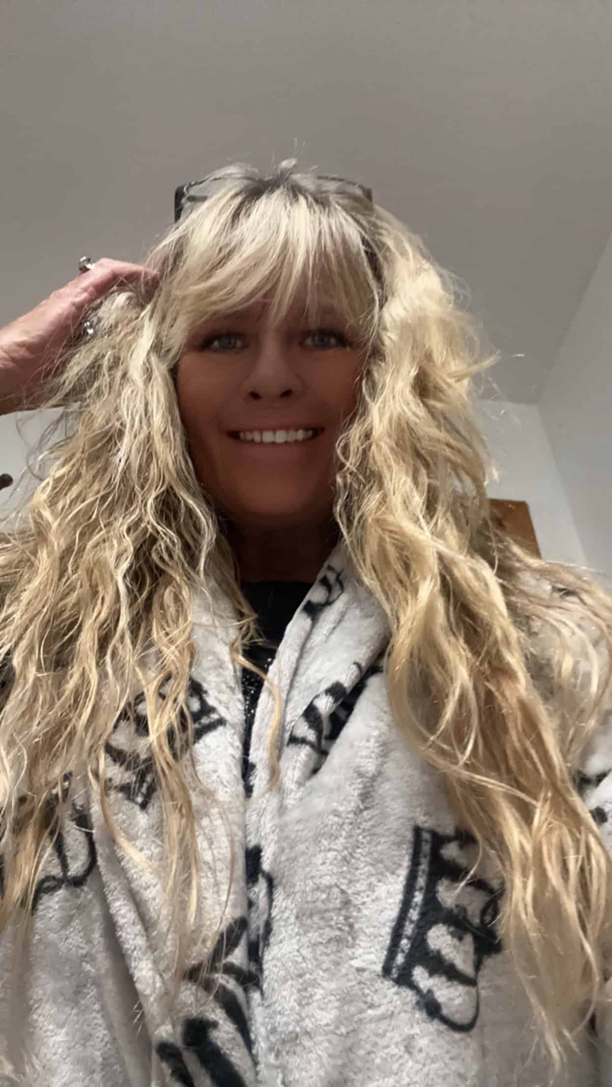 Blonde curly hair woman smiling in cozy fleece jacket, indoor setting.
